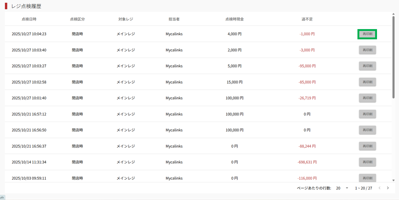 ・印刷したい精算時点を選択し、「再印刷」を押すと、精算レシートが印刷されます。