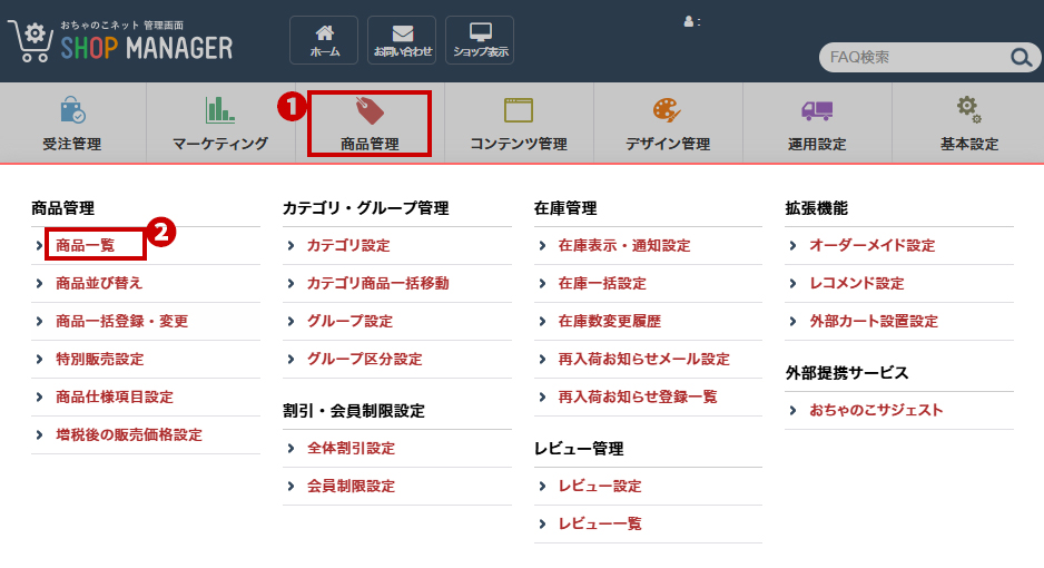 おちゃのこネット上で①商品管理をクリックし表示されたメニュー内の②商品一覧を開く。