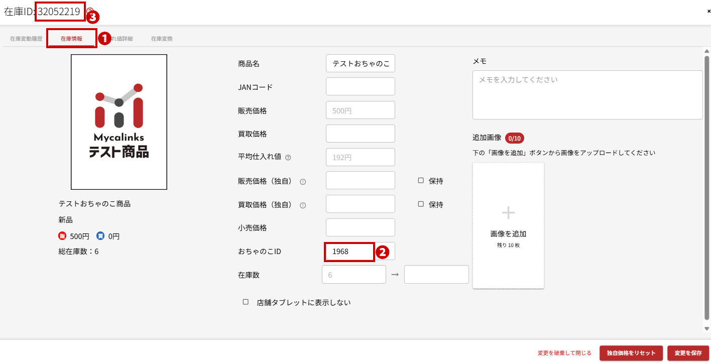 先ほどPOS上で確認した在庫IDを入力し変更を保存する。