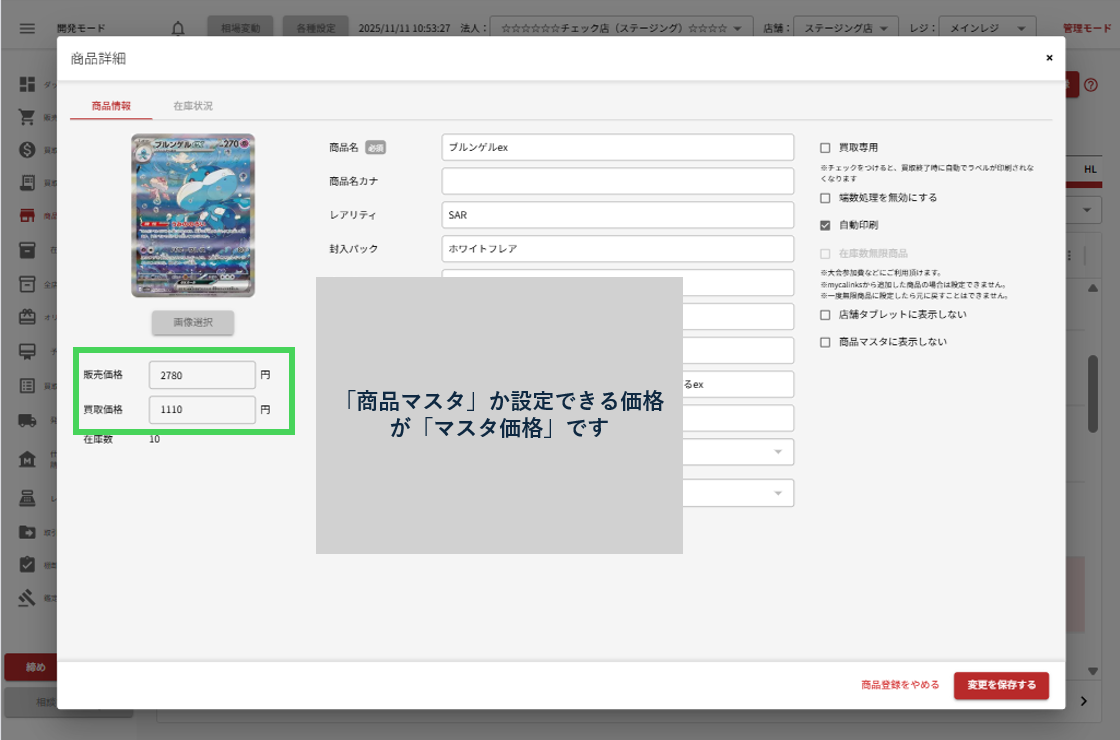 実際に店頭で販売するときに採用される価格です。在庫価格(独自価格)が設定されている場合は在庫価格が、設定されていない場合はマスタ価格が店頭価格となります。