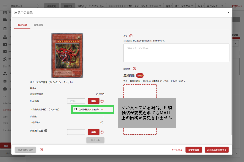 チェックを外してから変更を保存すると、店頭価格の変更時にMALL上の表示価格が自動出品価格に変更されます。