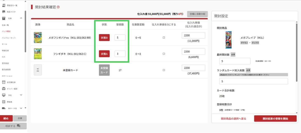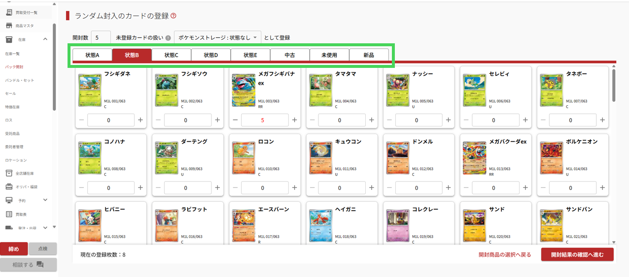 パック開封時に状態を選んでカードを登録できるようになりました。複数の状態を登録することも可能です。
