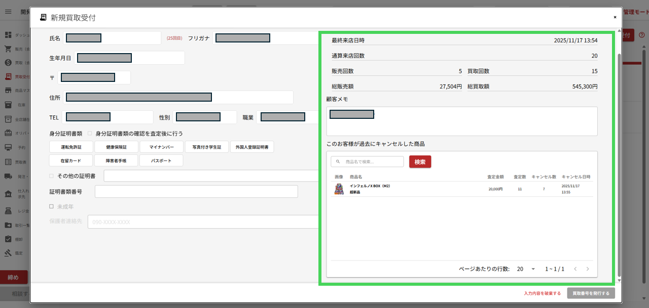 新規買取受付画面の右側で過去の来店状況、顧客メモ、過去査定後にキャンセルされた商品を表示が表示されるようになりました。