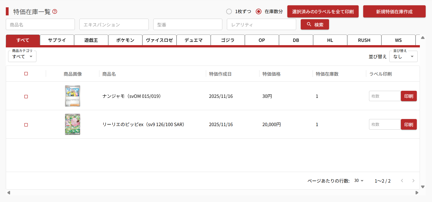 これまでは特価在庫にする前の状態がラベルに表示されていましたが、特価と表示されるようになりました。