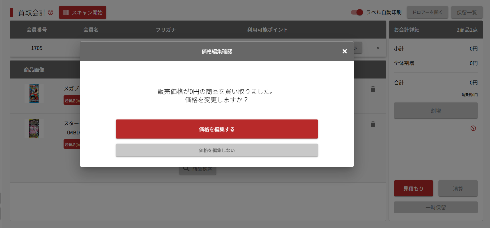 買取の際、商品マスタに価格が入力されてない場合は「価格編集確認」のポップアップが表示され、ラベルが印刷されませんでしたが、