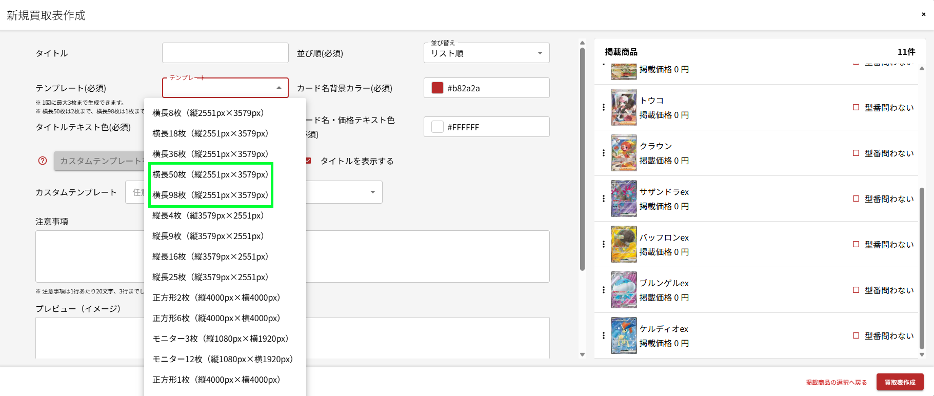 新たに50枚、98枚の買取表が作成できるようになりました。
