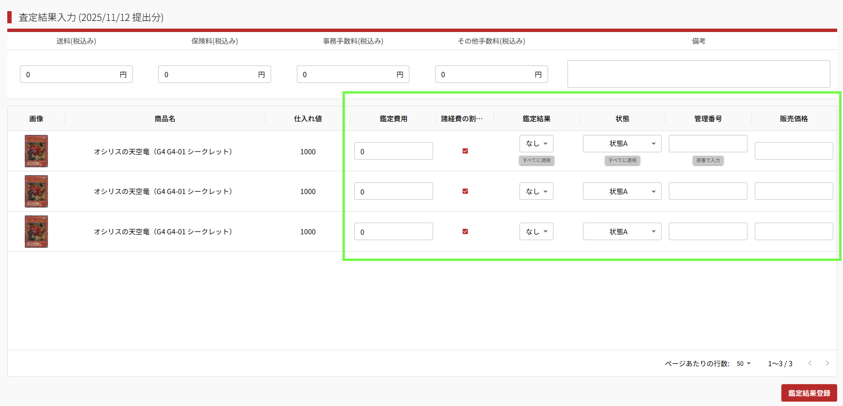 鑑定結果入力の際、同名カードでもそれぞれ別の値を入力することができます。
