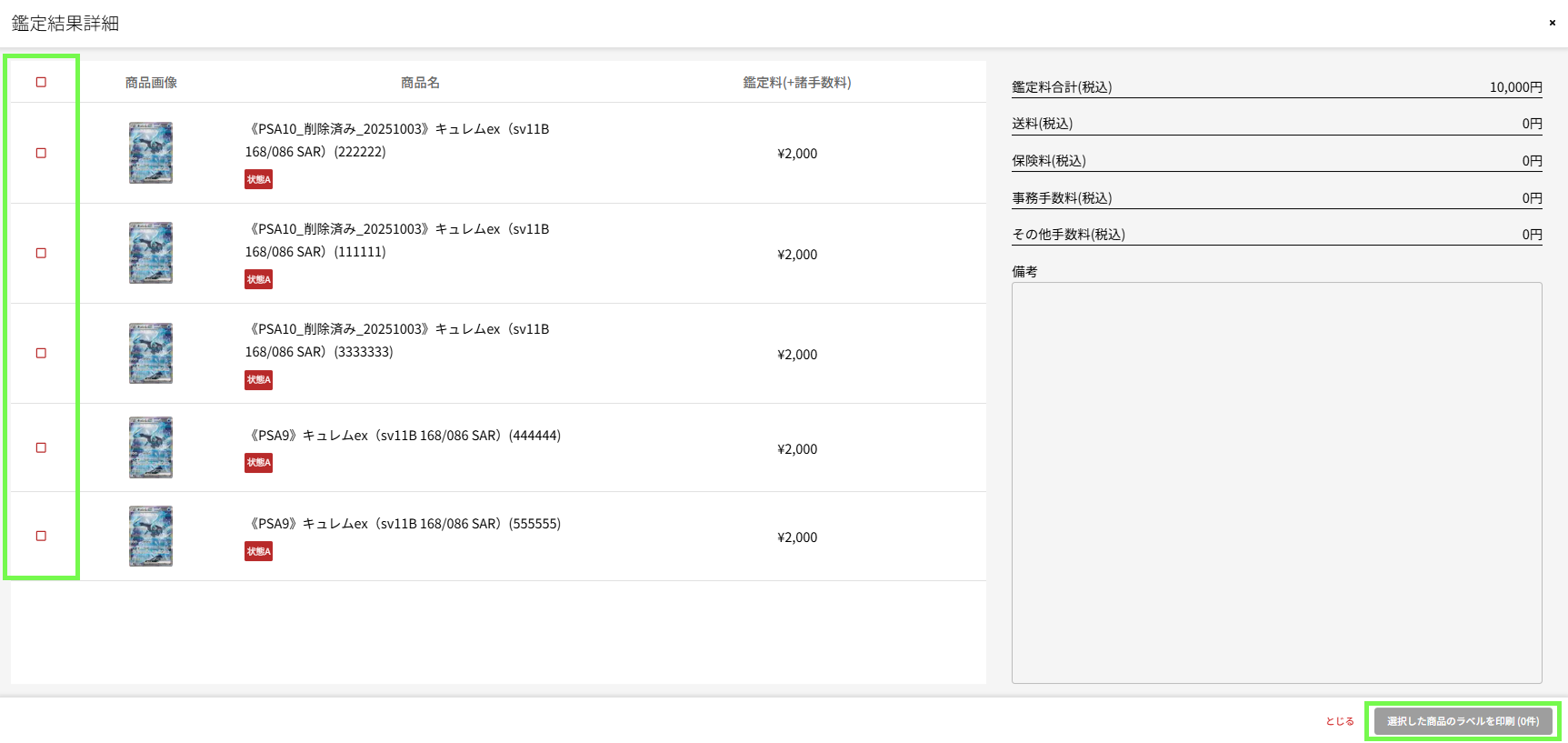 鑑定結果詳細のチェックボックスから選択したカードのラベルが印刷できます。