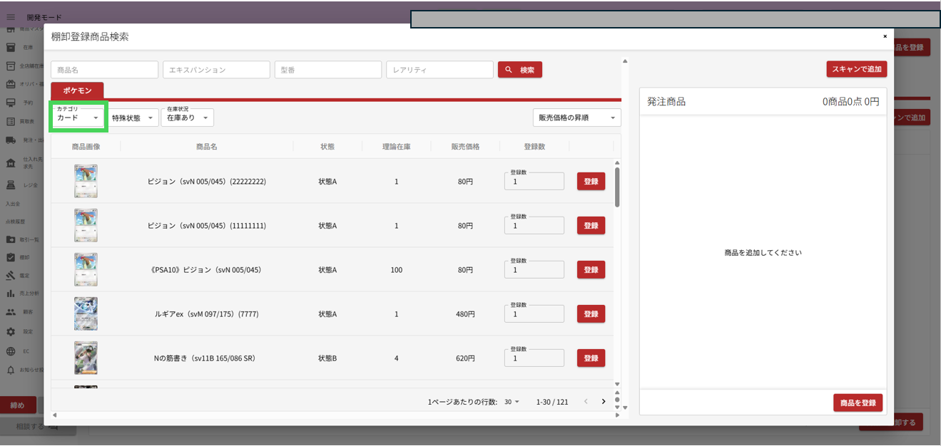 この変更に伴い商品検索モーダルではデフォルトのカテゴリとして「カード」が選択されております。「カード」以外のカテゴリを登録の場合は当てはまるカテゴリを選択して検索してください。