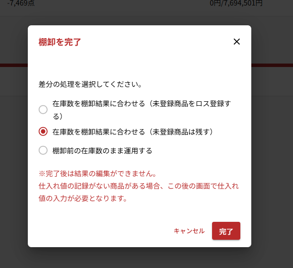 ・棚卸完了時に未登録商品の処理をロスとして登録するか選べるようになりました。