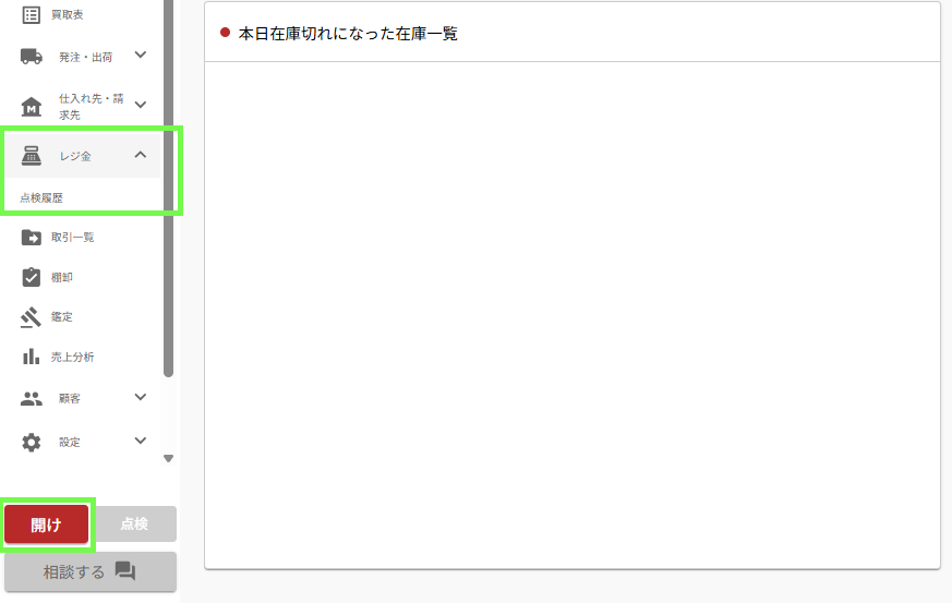 レジが閉っている状態ではとサイドメニューに「入出金」が表示されなくなりました。