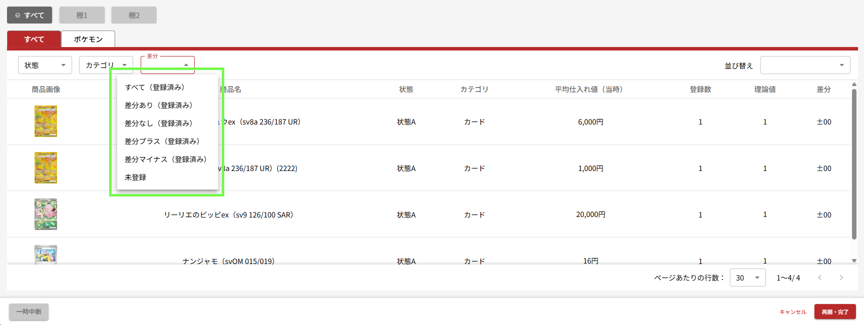 バンドル / オリパ(POS機能) / 福袋(POS機能) / デッキ(POS機能)カテゴリの在庫は棚卸機能では数量調整できません。増減があった場合は、各機能画面より 補充・解体 を行ってください。より正確に棚卸を行いたい場合は棚卸開始前に該当在庫を解体して単品在庫にしたうえで棚卸を実施することを推奨します。