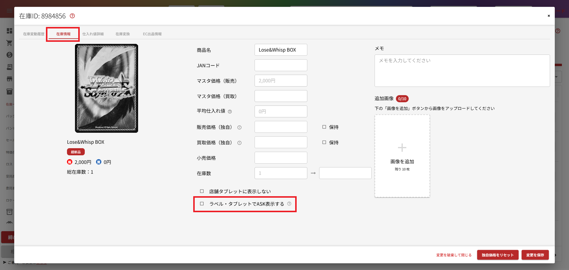 ・ラベルおよびタブレットで表示する在庫の価格表示に「ASK」を設定できるようになりました。