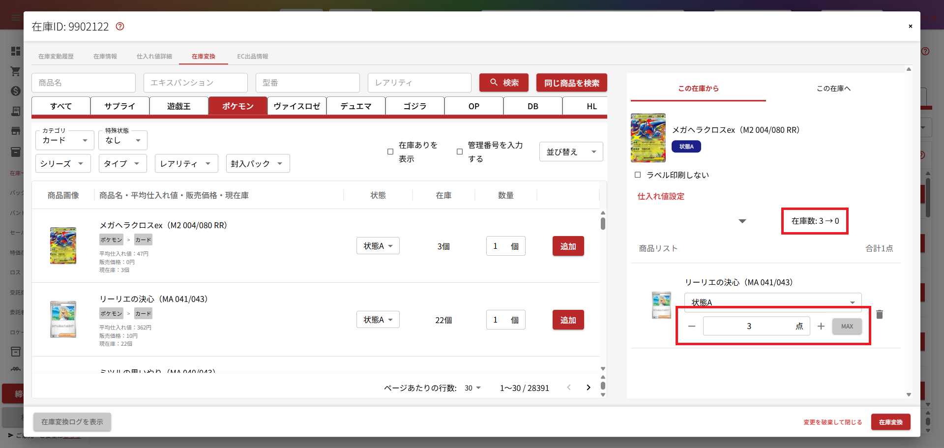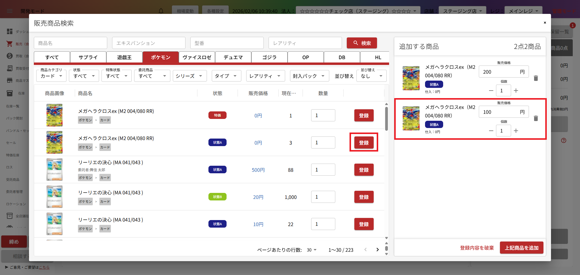販売商品検索画面で同じ商品で同じ状態の商品を登録する[追加する商品]に行が追加され、それぞれの商品に値段をつけることができます。