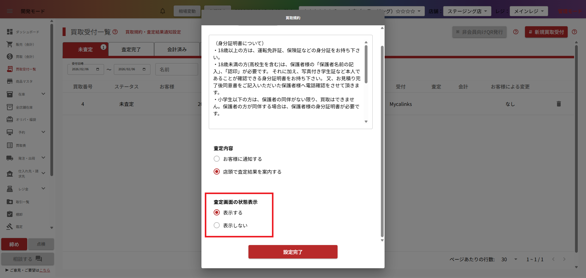 買取規約・査定結果通知設定とプリンター設定から状態の表示を設定することができます。