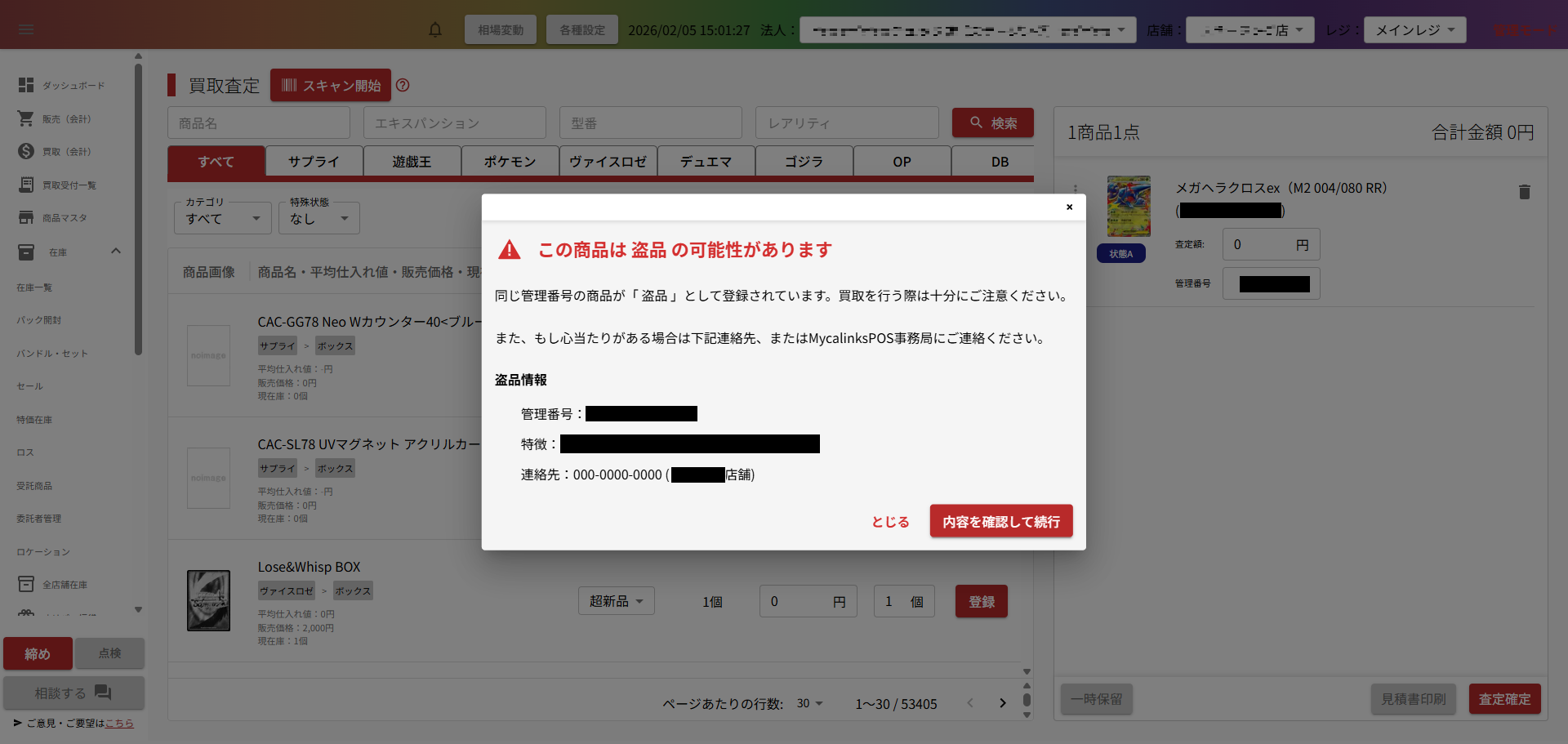 査定画面において、あらかじめ盗品として登録されている管理番号が入力された場合、注意を促すメッセージが表示されます。