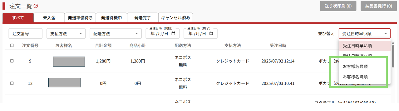 ・【EC】注文一覧でお客様名順に並び替えできるようになりました。