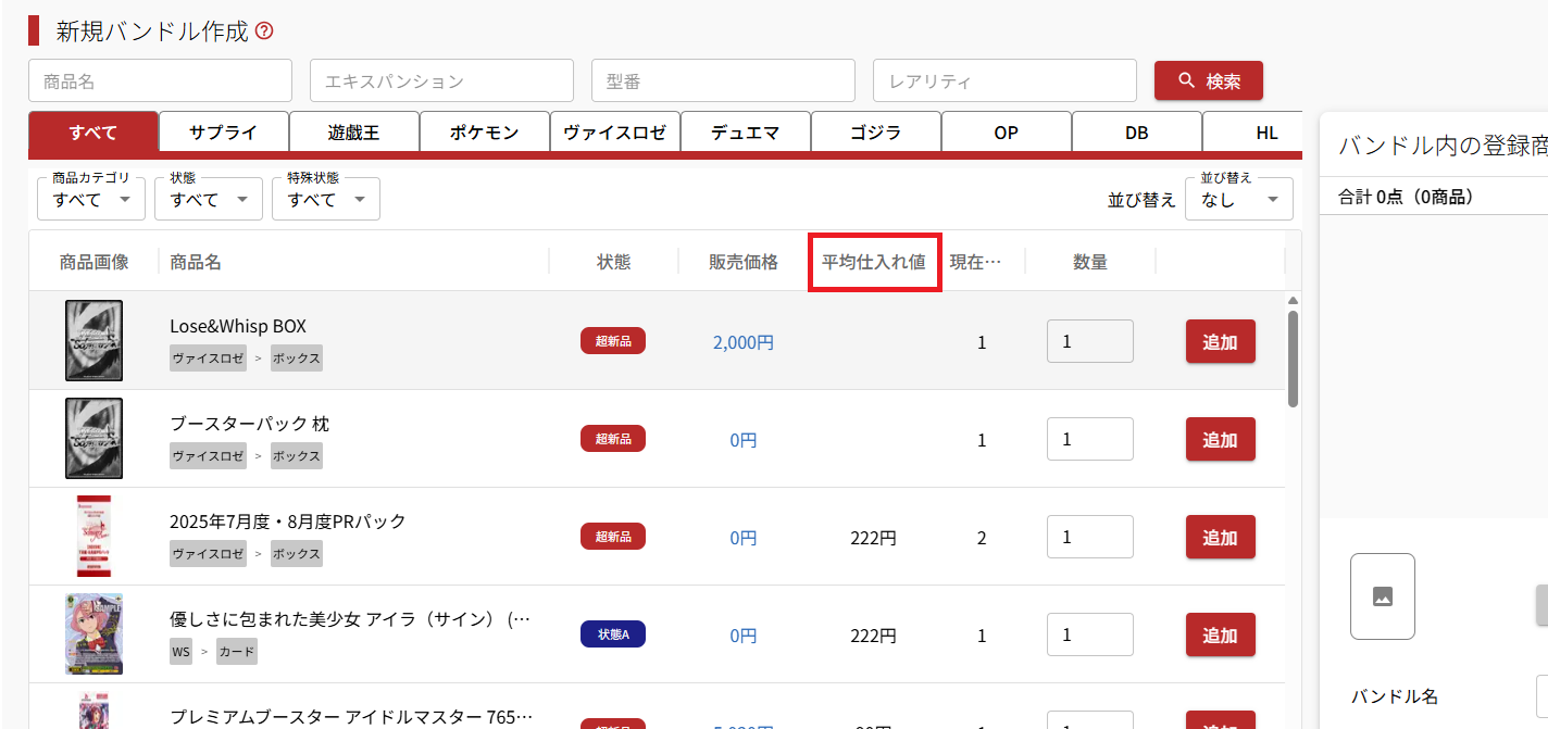 ・新規バンドル作成時に平均仕入れ値が表示されるようになりました。